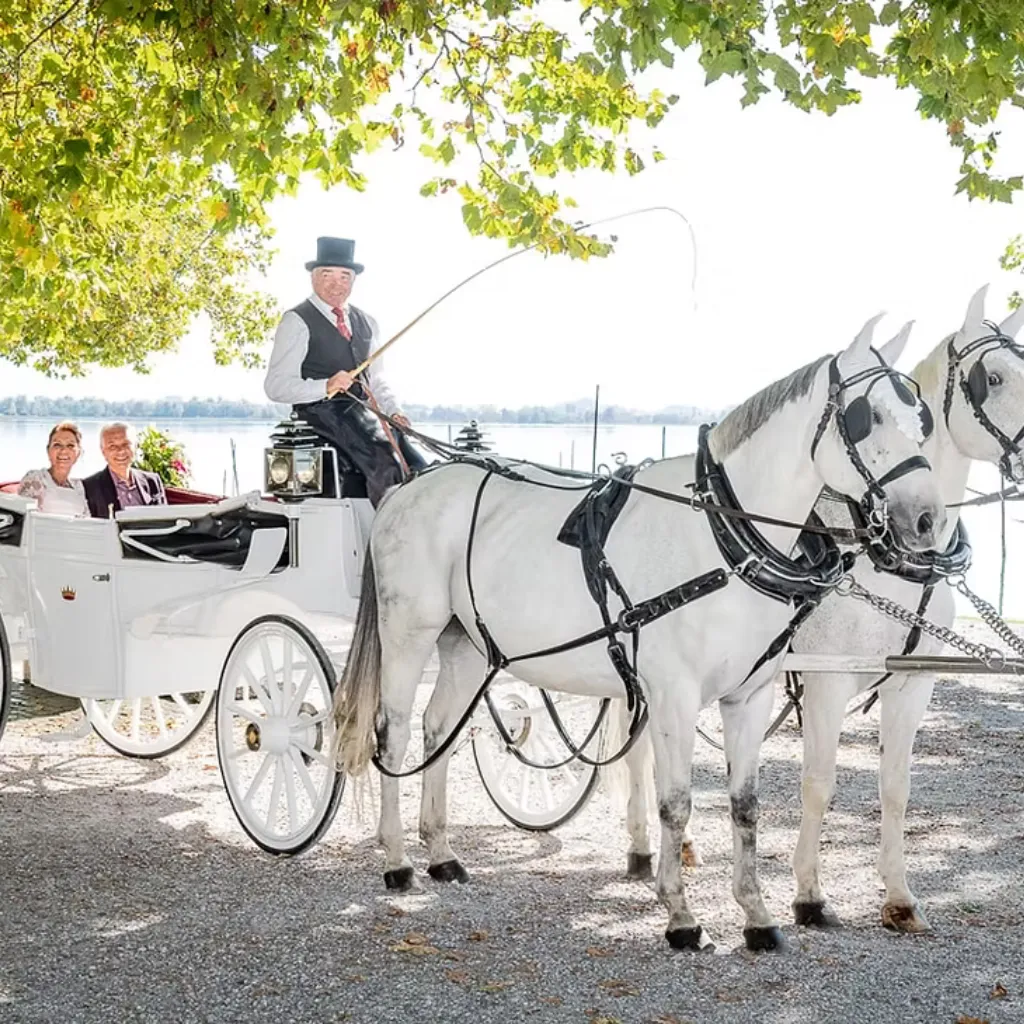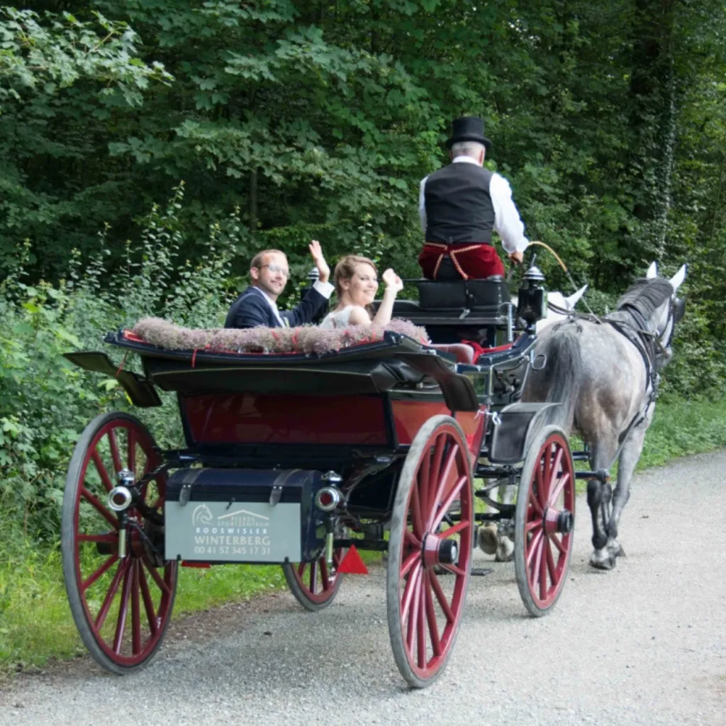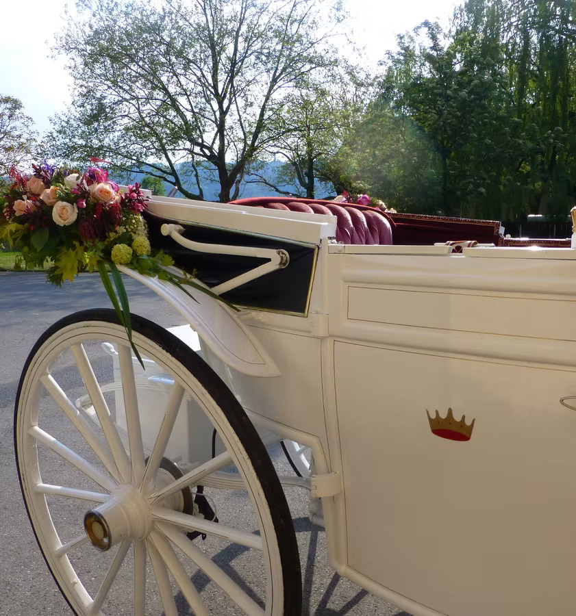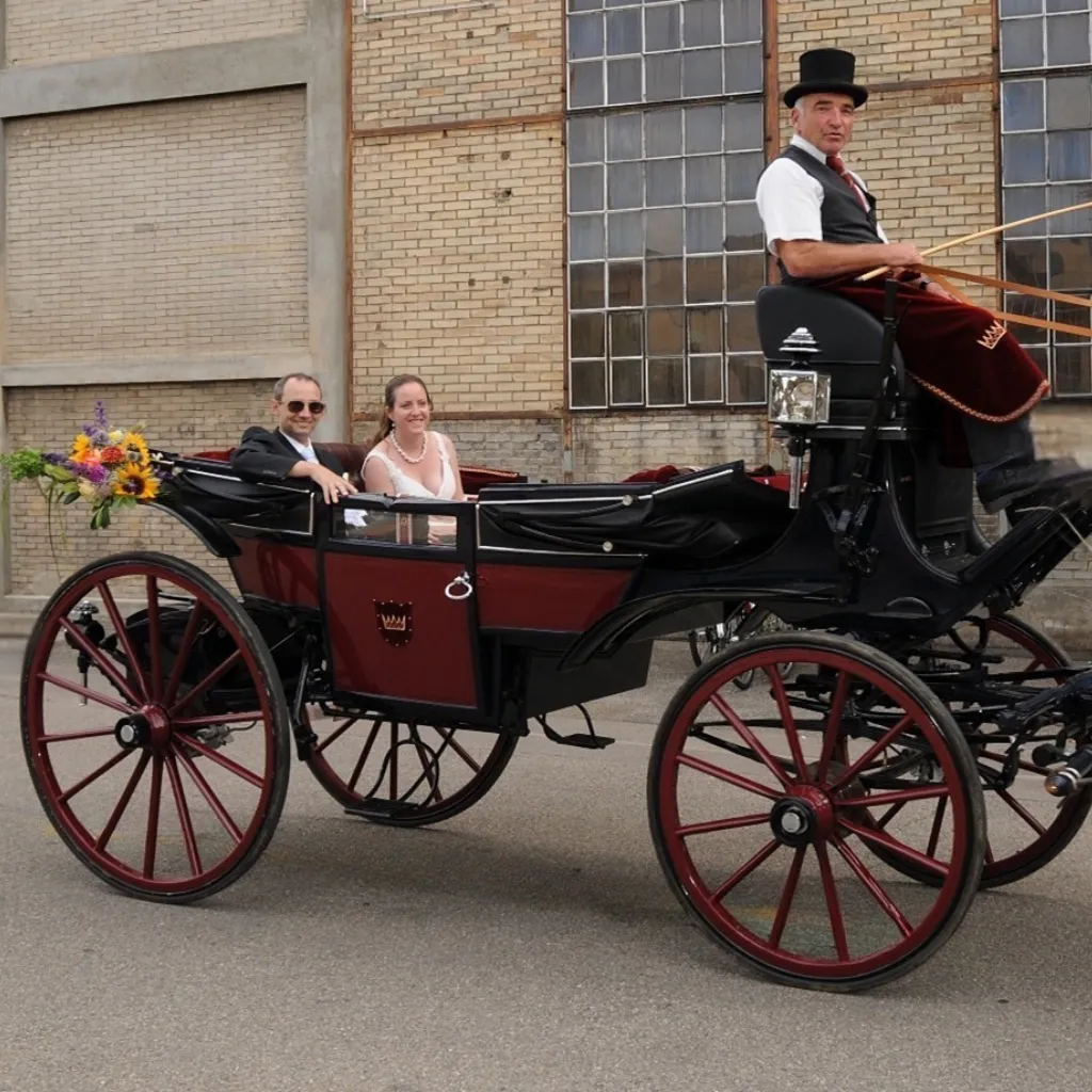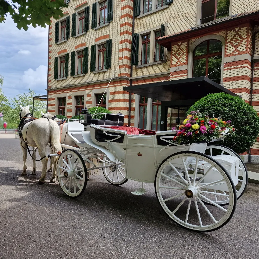 Lassen Sie die Hektik hinter sich. Geniessen Sie die ersten Minuten als Ehepaar in der würdevollen Stille einer prachtvollen Kutsche – ein Erlebnis, das bleibt.